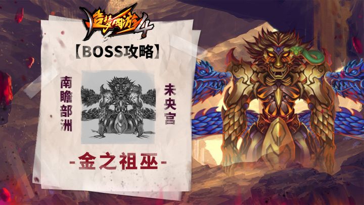 BOSS名称:金之祖巫BOSS简介:金之祖巫蓐收,十二祖巫之一,被通天教主释放之后,前往长安,为祸一方。出没地点:南瞻部洲-未央宫BOSS技能:>金龙吐息: 锁定玩家所在的方向,发射出一个光球>回旋巨斧:在低空处缓慢地来回移动,玩家被碰触到后会受到伤害,巨斧碰到地图边缘会反弹,受到攻击则掉落地面,玩家能踩在掉落的巨斧上攻略:金之祖巫作为十二祖巫之一,这个造型还是很有排面的!金龙吐息技能