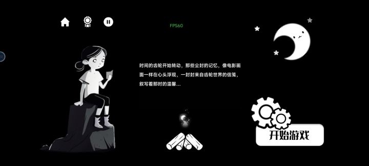 美术效果有些一般,场景很单一,动态效果主要是星星和齿轮的转动,星星落在齿轮上可以转动出五彩斑斓的特效,在黑白的世界中是唯一的色彩,似乎有一些寓意。界面和UI比较常规的单机游戏布局,功能比较少,逻辑清晰易理解。