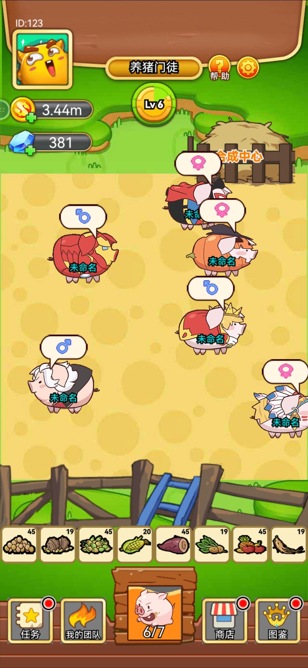 不到一个小时 1.点击食物,然后点地面,投喂。 2.为了点🐷方便,可以再次点击食物取消。 3.推荐1357位的食物,商店可以金币购买。 4.🐷可以三倍出售(目前没有广告) 5.为了集齐图鉴,🐷左下有合成,合成中心里面选择两头猪🐷(公母)可以合成。 6.(个人感觉)想合成三级,最好二二组合或二三组合,不同种,想高等级的就高等级同种合成。