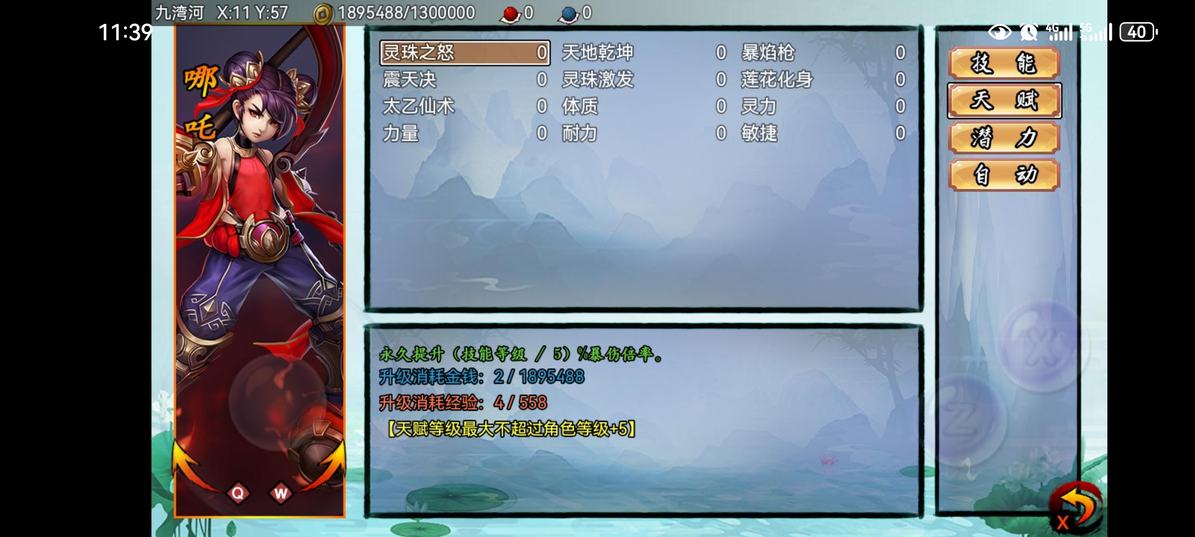 这游戏角色数量众多,当全部入队后有十五名角色,但出战人数只能五个,每个角色都有各自的特点,所以选择好出战角色至关重要。注意角色升级技能后消耗的蓝量也会增加,根据自己需求进行升级,五维属性的技能建议先点到五十级,前五十级银币需求不多,后面优先升级主属性。 首先是哪吒,哪吒资质一般,但技能很给力,新手建议不做重点培养,因为技能升级需要银币,像哪吒这种后期强势,而且非常依赖技能的需要大量银币,新手没有必