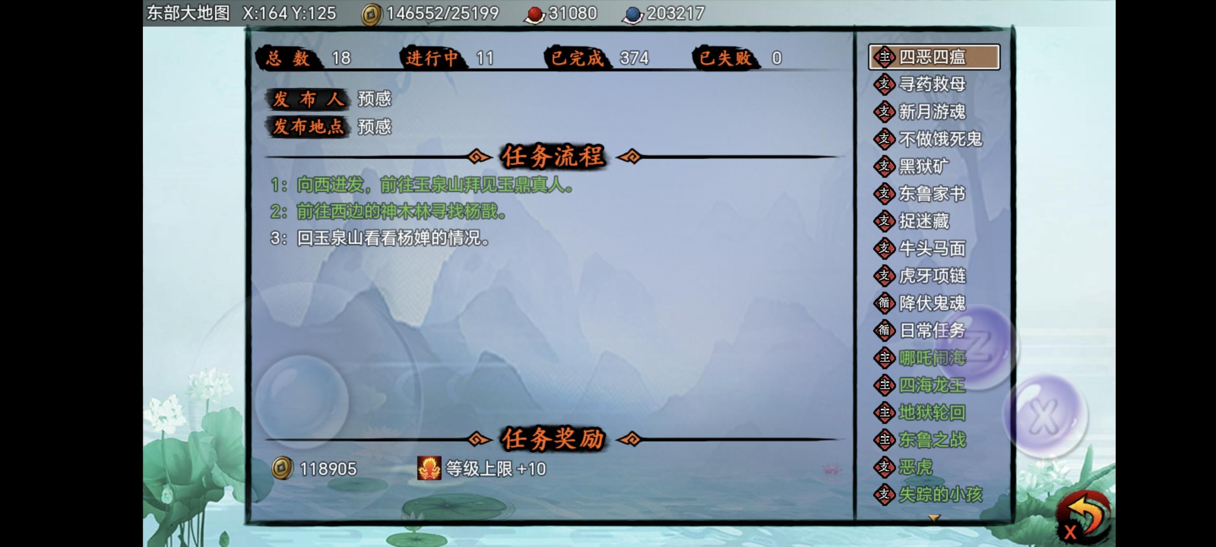游戏心得,每日任务要的物品,给的品质高可以多得储备金,抓鬼任务剧情过到5殿之后开启,抓鬼可以得大量经验和金钱还有很多物品奖励,其中重要道具圣兽挑战令可以到天上打四圣挑战爆不朽星辰可以换上古宠物,到最后BOSS地藏王进图右边幽冥房间可以拿到阎罗令可以瞬间回到抓鬼地方,每日前10个过双倍奖励建议吃双倍,我觉得带五个法宝宝效果比较好,鬼的等级和队伍等级之合有关。