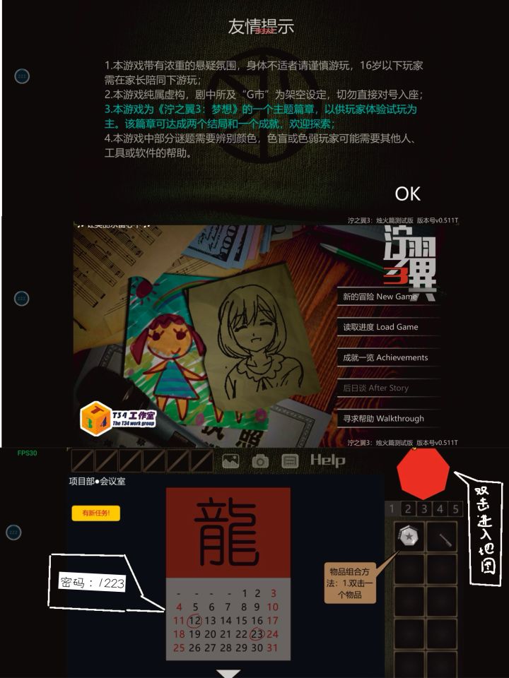 泞之翼3:烛火篇 攻略 作者:haolide1.选择完照片墙后,剧情结束后,现在在【废弃仓库·1号仓】。后退,点击右侧的井盖打开,下去,进入【废弃仓库·下水道】。触发剧情,大明离开队伍。转身,靠近左侧破碎的镜子,点击左侧打开的垃圾桶,从中得到【镜子的碎片】,但无法贴到镜子上。2.左转,点击左侧梯子,点击上方黑洞,殷颉把井盖顶开了。上去,进入【废弃仓库·3号仓】。触发剧情,发现“梅花女孩”(肩膀