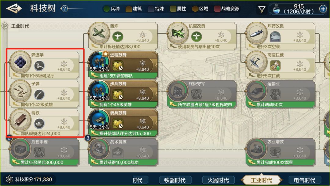 首先先来看看比较重要的科技有哪些吧 ①弹道学、子弹、钢铁 分别对应解锁地面部队的工业时代近战、远程、骑兵三大兵种,优先级最高的必开科技,能极大的增强部队的作战能力,很多平民队伍在解锁工业时代兵种之后都能比较轻松地挑战最高难度的资源地:十级地。 ②轰炸、机翼改良 主要的飞行兵种 轰炸科技可以解锁新兵种轰炸机,该兵种是后期最重要的拆迁兵种,其便捷的高机动性以及单次投弹的高额伤害都注定了其作为攻坚拆迁部