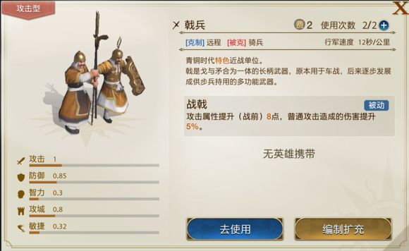 今天给大家带来英雄王吉加美士的英雄介绍 他是强力的智力英雄,依靠着英雄头衔和专属技能的暴击属性,让他在一回合内能打出极高的爆发伤害。 一、基础属性 吉加美士作为智力型爆发英雄智力属性属于t1级别,防御力只能算平庸,所以还是需要肉盾或者奶来辅助他,敏捷属性很高而且在镇定头衔的保护下不会被缴械,稳定在第一回合能打出伤害。 兵种方面的话吉加美士适合骑兵,在前期的青铜时代,我们可以选择智力型的突击骑兵,他
