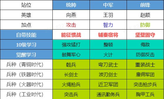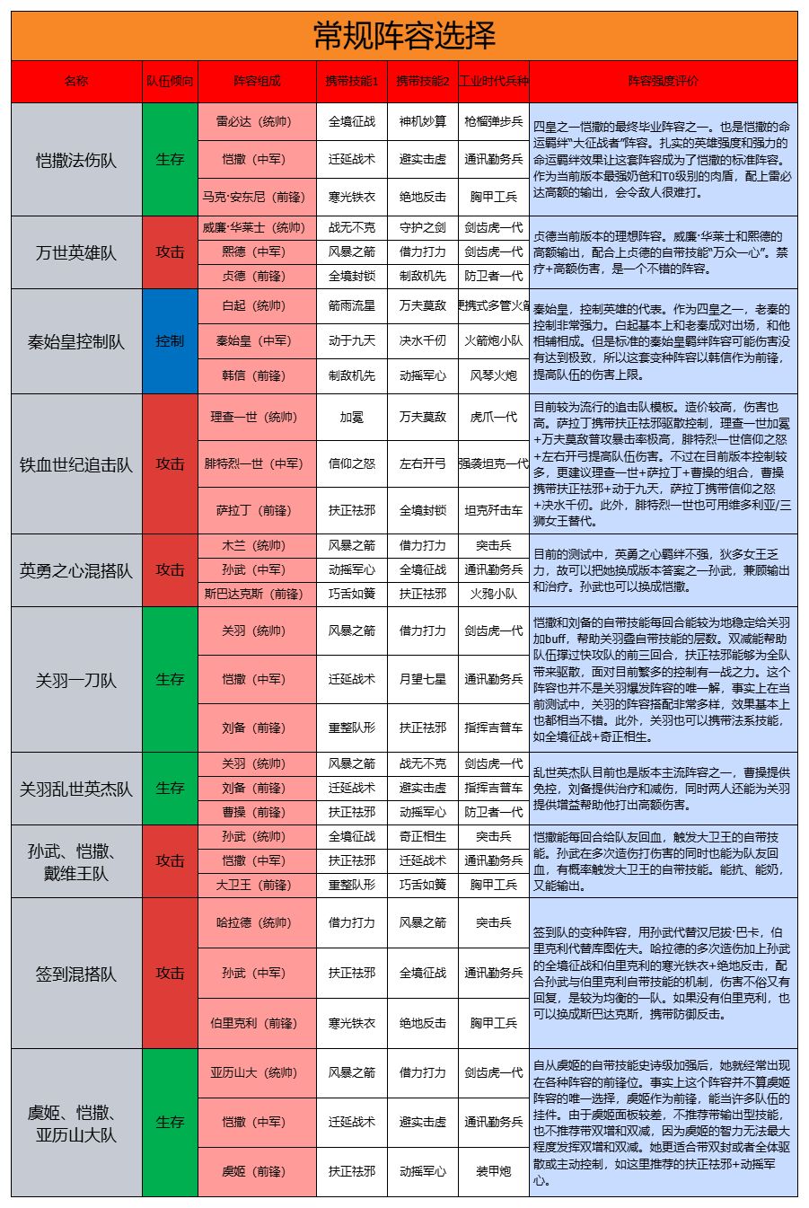 中华阵容,龙将、刘备和花木兰。 龙将作为三军统帅,在默认技能千里溃敌的基础上,额外学习了风暴之箭和破釜沉舟。 处于中军位置上的刘备,在默认技能仁德之君的基础上,后续装备了画地而守和备武修文。 前锋花木兰,携带长剑士出战,对于敌方远程单位有很好的克制效果,攻击时可以额外造成更多伤害。 西方阵容,哈兰德、汉尼拔和斯巴达克斯。 统帅的哈兰德,怒涛战吼之后再搭配长枪战术,对于敌方远程英雄的追伤效果极佳。 中