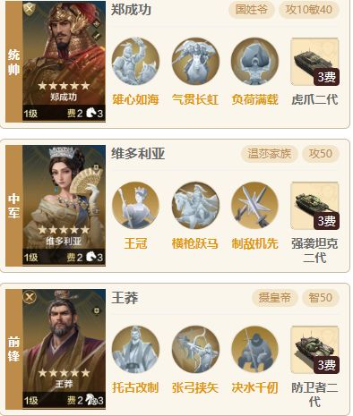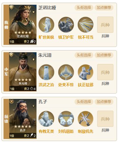 最近伊丽莎白女王也是得到了加强,整体的机制没变,额外加了一个自身行动时恢复自身兵力(恢复率30%),该效果会随着增益效果的数量额外提升,每多一个增益效果可额外提升10%,最大可额外提升5次。加强了自身的回复能力,再前排也更能占的住脚,可以抗更多的伤害,再加上分摊机制打我等于打自己,今天也是为大家带来一个伊丽莎白肉队的推荐。 一.阵容搭配 1.组队思路 统帅恺撒、中军孔子、前锋伊丽莎白女王,核心思