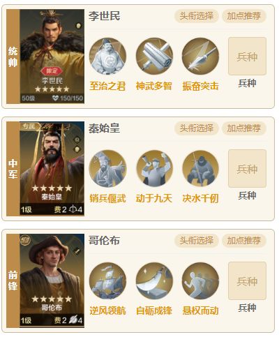 今天为大家带来一个李世民速攻的爆发配队,这个版本的李世民不缺伤害十分克制肉队,打满红肉队胜率非常高这版本因为有孔子的加入哥伦布又活跃了起来因为哥伦布的增伤十分强悍。三个英雄都有很强的输出能力,哥伦布和秦始皇更是爆发的好手,很容易一回合直接结束战斗。虽然面对高速肉队依然处于弱势,胜率较低,但不再无脑挨打,超高的爆发下没有一回合被秒就可以给予对面重创。 一.阵容搭配 1.组队思路 统帅李世民,中军秦