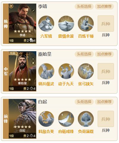 今天为大家推荐一个绝对爆发的阵容, 李靖和白起的自带技能都是由控制触发,虽然触发的判定不一样,白起也是李靖很好的下位替代,但是他们2个可以放在同一个阵容下,也可以打出爆炸伤害,今天就为大家推荐这个大秦爆发队。 一.阵容介绍 1.组队思路 统帅李靖,中军秦始皇,前锋白起,这队只靠秦始皇的控制,所以会比较吃脸,触发双控制就十分强势,甚至可以一回合秒杀,只打了一个控制就会弱一些。新的技能自砺成锋也很适合