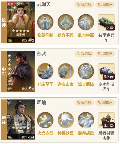 又又又来拷打芝诺队了,这队也是花式暴打芝诺队,但不是追击的对手,不过把武则天放在统帅看着唬人让对面不敢撞你其实一遇到追击就滴尿了,打芝诺肉队和秦始皇托米队是一把好手直接花式吊打 一、 阵容介绍 1.组队思路:统帅武则天、中军孙武,前锋周瑜,周瑜和孙武组队打输出,武则天在统帅防爆头,但遇到追击还是会被爆头,这队主抓托米和芝诺队其他队,遇到主动和追击打不过。 2.技能搭配 (1) 武则天携带处变