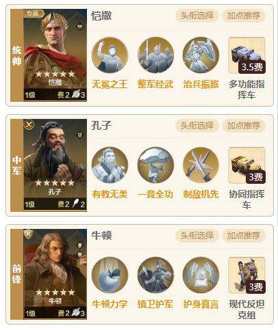 今天为大家推荐一个牛顿孔子反击队,有了孔子的护盾加持,牛顿无需掉血就可以进行反击,搭配恺撒的高额回复,可以做到轻松无损击败所有追击队伍。在内战方面,即使是白板打满红武则天肉队也可以做到低损平局,但还是比较惧怕主动爆发队,会被直接爆头。 一.阵容介绍 1.组队思路 统帅恺撒、中军孔子、前锋牛顿,牛顿对比芝诺比娅的优势在于更强的输出能力,虽然减少了控制,面对追击队时能够主动出击造成高额伤害,往往3回合