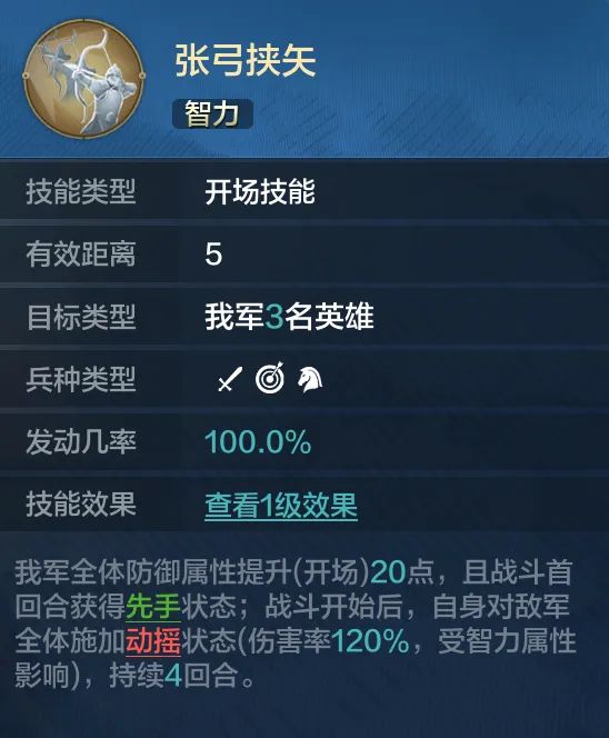 今天为大家介绍《世界启元》无限纪元「定海平波」的拆解技能,这赛季只出了四位新英雄但是每个英雄都有各自的拆解技能,相比前几个赛季多了一个拆解技能可以选择,四个拆解技能的强度都十分不错 一。张弓挟矢 1. 【张弓挟矢】来自于英雄拆解-郑成功 技能满级效果:我军全体防御属性提升(开场)20点,且战斗首回合获得先手状态;战斗开始后,自身对敌军全体施加动摇状态(伤害率120%,受智力属性影响),持续4回合。