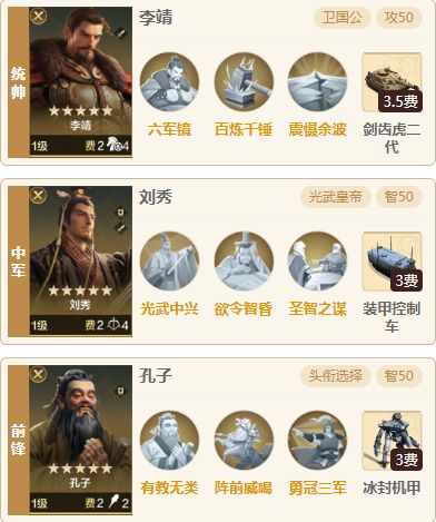 经过一周多的历练,现在也是出现孔子的最佳用法——哥刘孔。这队不是需要红度,头衔最好要有,集伤害、护盾、恢复、控制于一身,白板就可以打大多数队伍,今天就让我们一起来看看这套无敌孔子配队。 一.阵容搭配 1.组队思路 统帅哥伦布、中军孔子、前锋刘秀,孔子提供护盾+控制可以很好保证队伍的生存能力,刘秀提供恢复,用自身的高发动几率来提供驱散和锁闭,不仅可以杜绝绝大部分减益效果,锁闭还可以然封锁开场技能,比