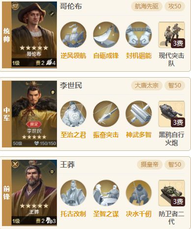 今天为大家带来一个哥伦布追击队伍,这个队伍也是为了最近比较强势的孔子研发,超高的伤害可以轻易洞穿孔子队的防御。哥伦布搭配追击也算是一个比较少见的阵容,一起来看看吧! 一.阵容介绍 1.组队思路 统帅哥伦布,中军萨拉丁,前锋维多利亚,比较少见的由哥伦布打追击的阵容,哥伦布一般都是最后自带技能打伤害,哥伦布的结算是普攻打完再去结算自带技能的,自身的追击普攻也是可以为自带技能叠加层数,所以追击哥伦布同样