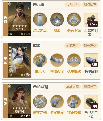 今天为大家带来一个比较冷门的英雄希帕蒂娅的配队,由朱元璋、虞姬、希帕蒂娅组成也算是朱元璋虞姬队的变种,这个配队比较便宜,组件都比较好获取,平民玩家都可以组成,就是比较看脸,脸好碰倒什么队伍都可以碰一碰,算是一个赌脸阵容。 一.阵容介绍 1.组队思路 统帅朱元璋、中军虞姬。前锋希帕蒂娅,希帕蒂娅的控制效果很强力,可以控制敌军2名英雄2个回合,还可以提升我军的智力属性,缺点就是发动几率太低,仅仅只有3