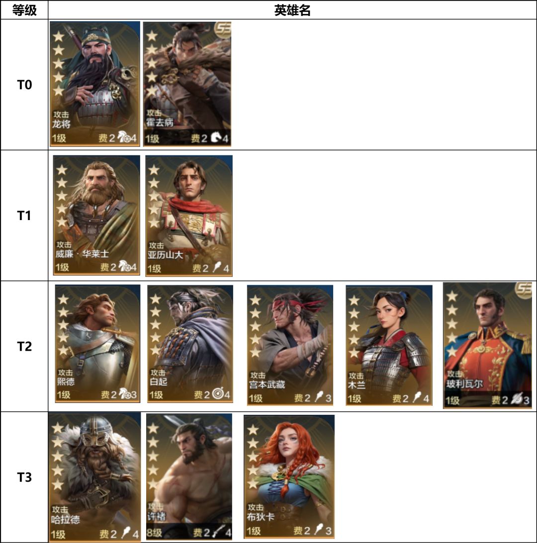 各位开拓者们大家好!到目前为止,《世界启元》的无限纪元「定海平波」即将开启,为了帮助更多玩家了解《世界启元》中各种英雄的强度,为大家整理了这期各类功能英雄排行榜,快看过来吧!(注:部分英雄可以携带不同技能有着多种玩法,所以表格中部分英雄将会重复出现,如:关羽可作为物理伤害英雄也可作为法系伤害英雄,曹操可作为中军辅助英雄也可作为前锋肉盾英雄) 一.输出类 (1)物理伤害 (2)法系伤害 (3)物理追