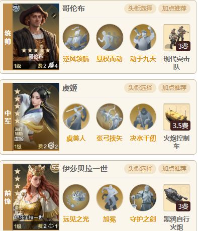 阵容相比S4的前锋秒杀队区别不大,只是把秦始皇换成虞姬和在技能方面做了些许调整可以让这个阵容更适应这个赛季,让各位都知道并不只有威廉华莱士可以稳吃芝诺队,这队的造价更低,无需携带璀璨技能,对红度的要求也不是很高,不过都玩6个赛季了大家虞姬的红度也不会低吧!头衔有就开没有就不开,不像贞德是十分依赖头衔加持的 一、 阵容介绍 1.组队思路:统帅哥伦布、中军虞姬,前锋伊莎贝拉一世,伊莎贝拉一世速度比哥伦