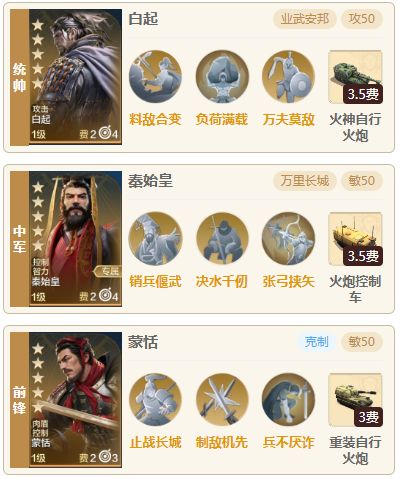 发现又有一些经典大秦队伍出现在战场上,我也取试了试发现效果还不错,今天就为大家来推荐推荐这一队新版大秦,不能打肉队依旧是大秦的弊端,但是目前主流的追击和主动队都是可以打一打的。 一.阵容介绍 1.组队思路 统帅白起、中军秦始皇、前锋蒙恬,经典的一统天下命运配置,得益于负荷满载的加入,提升了100%的攻击伤害,让白起的伤害终于能够脱离老九门的档次,能和新纪元英雄比一比,秦始皇和蒙恬也都能够给到足够的
