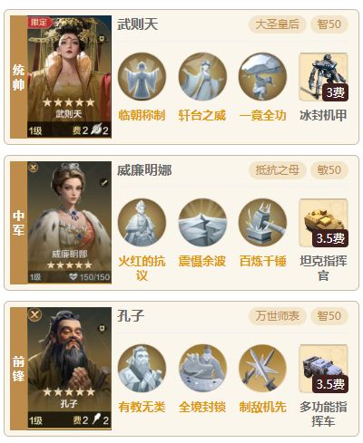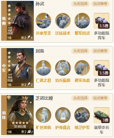 队伍相比武则天和大头恺撒来说获取难度较低一点,一般玩满6个赛季且有充值月卡的玩家要凑一套这个阵容难度并不会很高,虽然需要两个璀璨技能,但是治兵振旅可以用其他治疗技能替代,阵容强度不错,肉队里面除了也是带芝诺的,遇到其他有高红度的肉队是可以单吃的。 一、 阵容介绍 1.组队思路:统帅孙武、中军刘备,前锋芝诺比娅,刘备可以用来替代恺撒,刘备不止有奶量还有属性提升,在一些特殊情况下队伍阵容的提升还可能