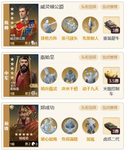 《世界启元》无限纪元定海平波经过了新年,战斗已经进入了白热化状态,今天为大家推荐一套这个剧本非常强力的郑成功先手配队!由郑成功、秦始皇、威灵顿公爵组成,由于郑成功的攻击距离只有3,所以需要把他放在前锋位,让他可以打的到对面统帅。加上威灵顿的减防御和秦始皇的先手爆发控制,伤害十分恐怖! 一.英雄介绍 统帅:威灵顿公爵 威灵顿公爵也是比较实用的精英武将,开场减智力和防御的效果非常强力,加上先发制人抢先