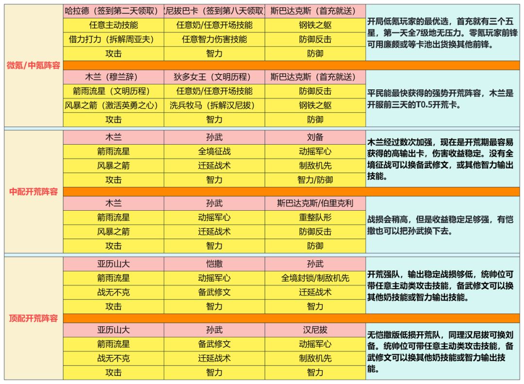 今天给大家带来世界启元新手向的开荒攻略,闲话少说我们直接上干货。 一、开荒阵容推荐 二、开荒英雄推荐 TIPS:如何选择英雄? 在开荒期大部分达到A级标准的英雄即可作为主力1队,尤其是统帅位英雄,评级达不到A的大部分属于输出不够或前期养成难度过高。 在开荒期的阵容选择上大多数都是以1输出(统帅)1奶妈(中军)1肉盾(前锋),这种模式来进行配队,以求战损不至于太高。 世界启元S1统帅
