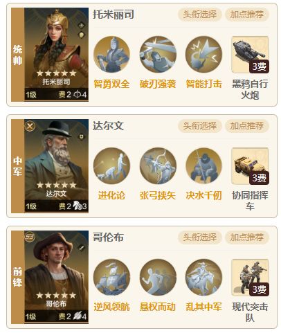 新英雄达尔文,自带技能能够为队友加非常多种BUFF,并且由普攻触发适合一些追击英雄,今天就为大家带来一套达尔文的配队。 一.阵容搭配 1.组队思路 统帅托米丽司、中军达尔文、前锋哥伦布,思路类似原先的托米自爆队,托米丽司为哥伦布叠加自带技能,达尔文可以为队伍提供BUFF,虽然BUFF比较随机,暴击率,溅射,闪避,俘虏,无视闪避,先手,连击,霸体,但是吃到哪种BUFF都可以接受,有新技能张弓挟矢,可