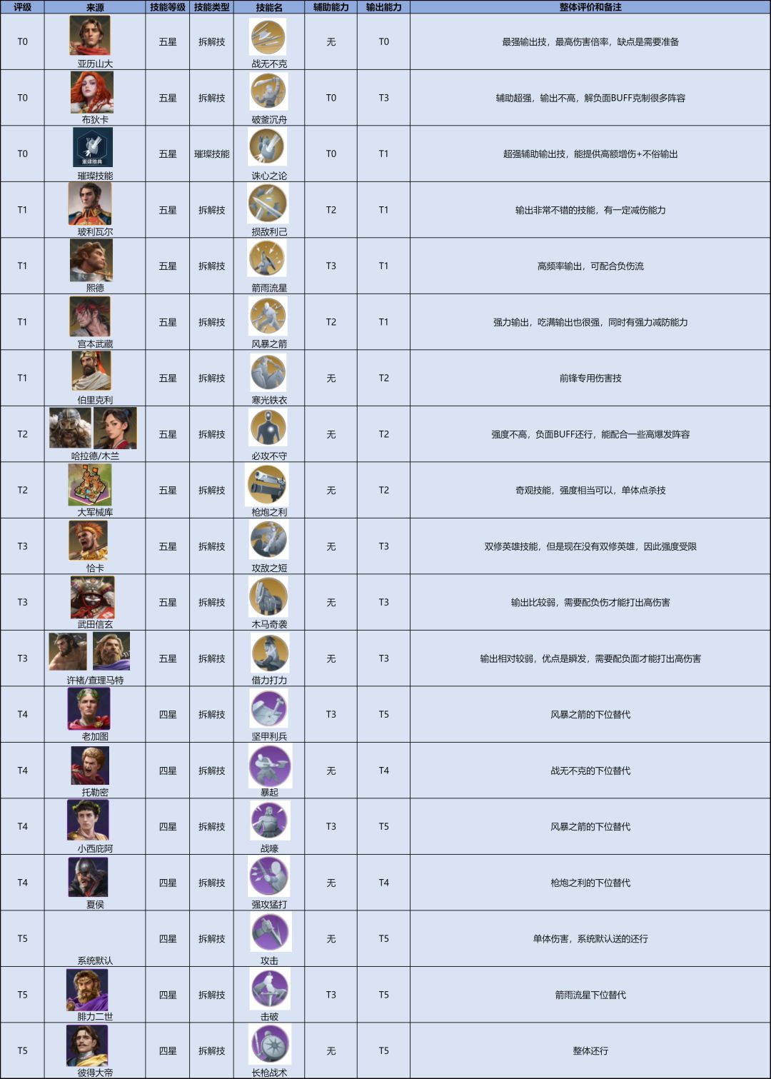 开荒常用英雄 一、物理主动输出 T0 T1 T2 二、 法系主动输出 T1 三、 物理追击输出 T1 T2 四、 智力追击输出 T0 T1 五、增伤辅助类 T1 T2 六、减伤回复类辅助 T0 T1 T2 七、防御类前锋 T0 T1 T2 八、功能类前锋 T1 T2 开荒常用技能 一、 物理主动输出 T0 T1 T2 二、法系主动输出 T0 T1 T2 三、物理追击输出 T1