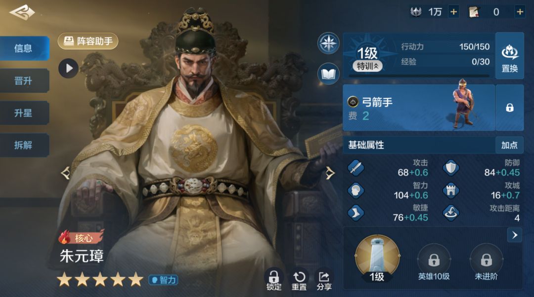 今天为大家介绍的是《世界启元》S5赛季的新英雄朱元璋的角色定位,技能强度,头衔进阶,技能搭配,配队预测等各个方面。 一。属性面板 朱元璋携带的是远程兵种,并且有着104的智力属于全游戏一线水平,仅次于周瑜、汉武帝、秦始皇、诸葛亮,排在第五。84的防御比较中规中矩,毕竟也不需要在前排吃伤害。 二。技能解析 朱元璋的自带技能需要搭配我军的主动技能触发,尝试发动主动技能即可有概率触发造成伤害,并且在我军