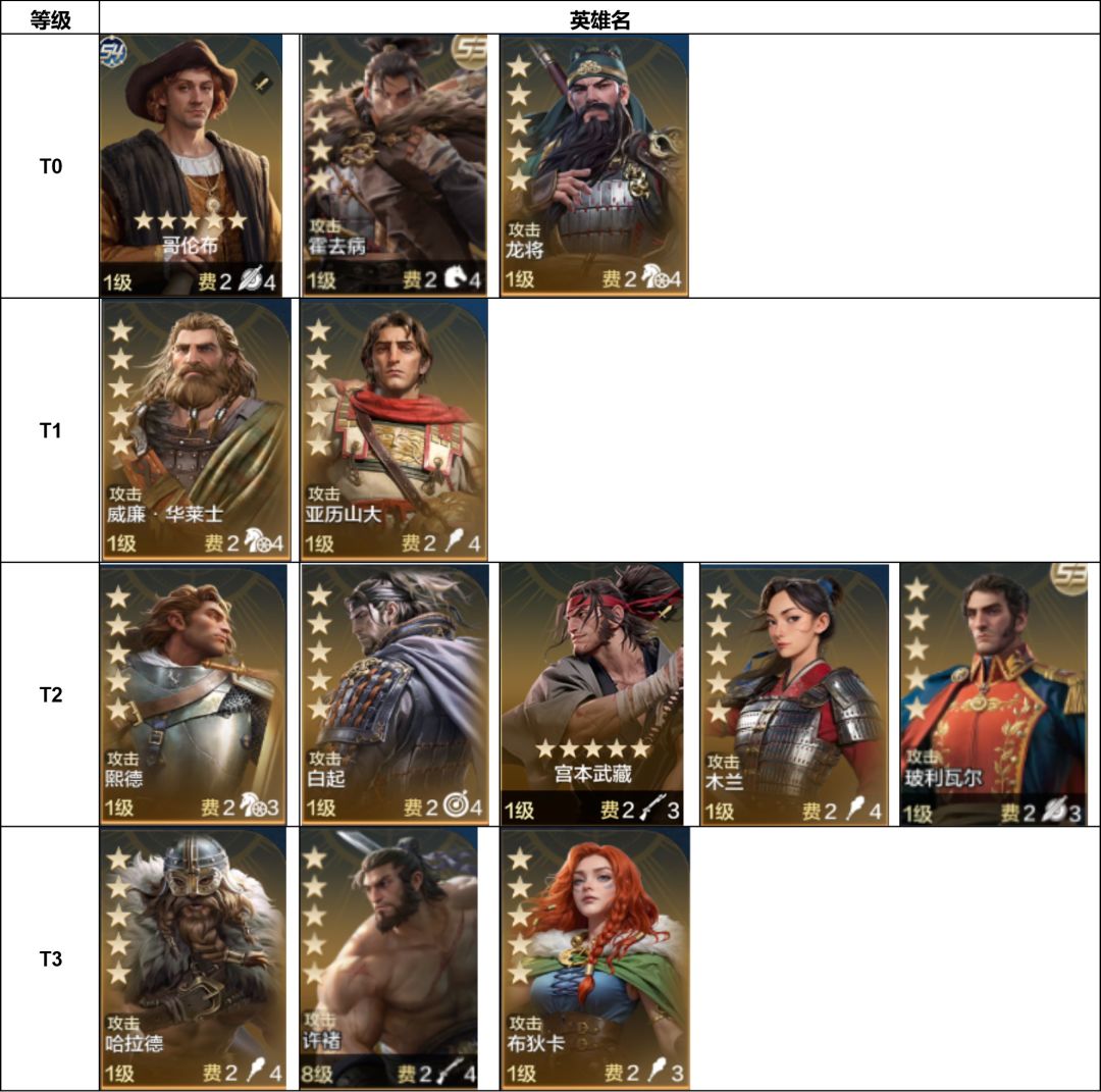 一.T0 英雄热度:神话 卡包抽卡来源和爆率:默认大卡池可抽,没有小卡包。获取难度高。 以下为T0英雄: 二.T1 英雄热度:传说 卡包抽卡来源和爆率:博览会主题将,爆率珍稀。或者是只能用伟人点数换。 以下为T1英雄: 三.T2 英雄热度:史诗 卡包抽卡来源和爆率:有些是博览会主题将,有些是配角。配角大部分爆率为第二等级 以下为T2英雄: 四.T3 英雄热度:稀有 卡包抽卡来源和爆率:大部分为配角