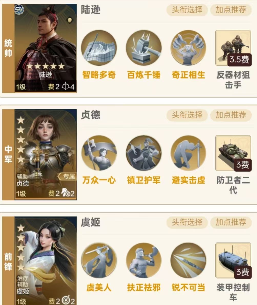 一、 阵容介绍 1. 组队思路:统帅陆逊、中军贞德,前锋虞姬,贞德必须开头衔,大家都S4赛季末期了虞大家姬的红度肯定不低,虞姬力竭可以有效克制一些爆发阵容,不过这里虞姬需要点一手敏捷保证出手比陆逊快优先释放扶正祛邪给陆逊提供数值的加成以打出更高的伤害 2.技能搭配 (1)陆逊携带风百炼千锤和奇正相生:百炼千锤提供韧性及增伤,奇正相生可以直接引爆陆逊自带技能得灼烧效果,亲测陆逊带这两技能是伤害最 (