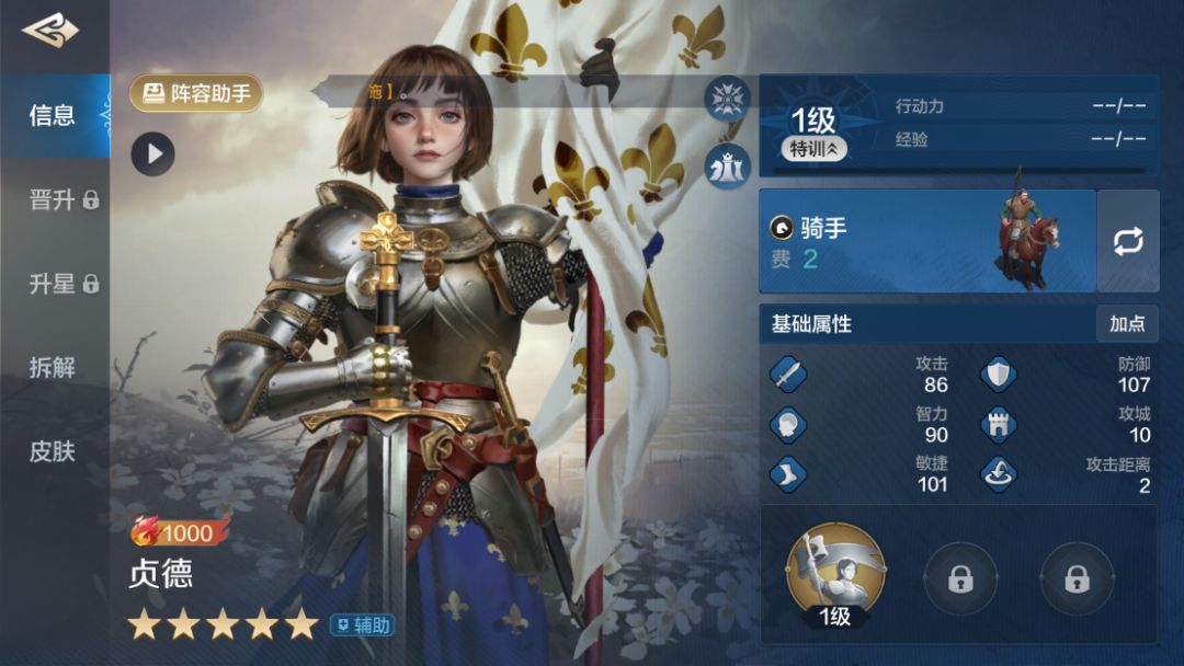 一、基础属性 贞德的面板属性极为优秀,虽然核心属性智力初始只有90,但是防御和敏捷都是来到了100+,非常超模。 后续贞德的加点可以按照搭配的阵容去加点,也是非常灵活。如果作为前锋当肉盾或者控制抗伤,贞德就防御智力对点,当工具人就全点智力提升首次伤害加成。 二、英雄头衔 贞德专属头衔精神领袖,能够使贞德的自带技能固定对两名友军生效。 贞德的自带技能是每回合随机1-2名友军首次尝试发动伤害类主动技能