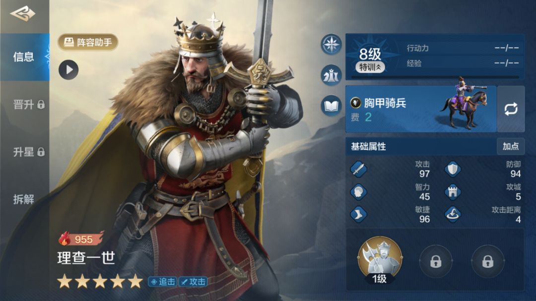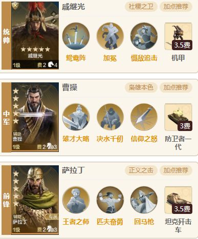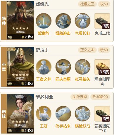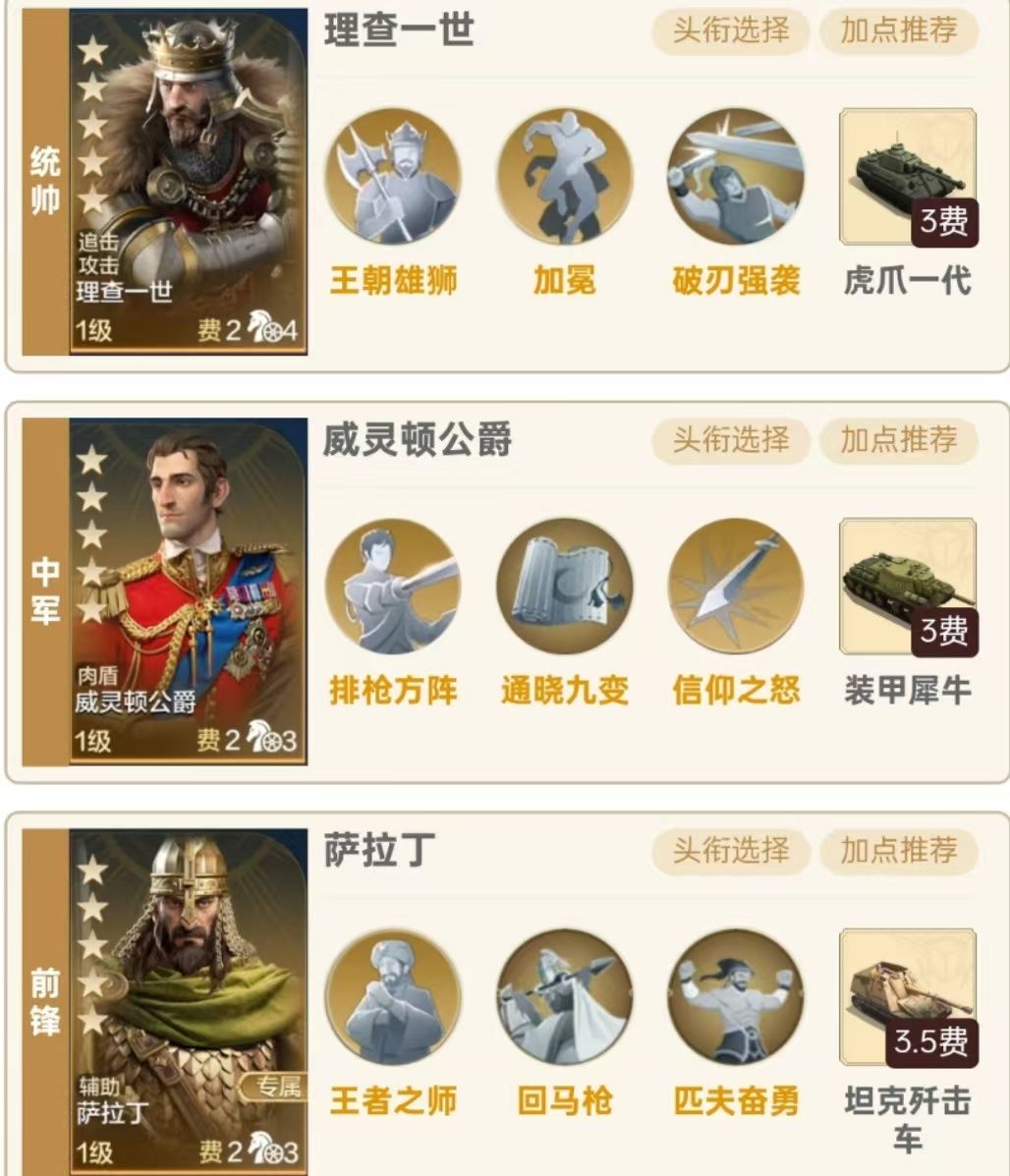 一、 阵容介绍 1.组队思路:统帅理查一世、中军威灵顿公爵,前锋萨拉丁,威灵顿公爵可以有效降低敌方防御力使得对面及其的脆,追击内战时候只需悄悄点一手速度,已知戚继光50级未点速度为179点,理查一世为171只需点9点速度即可,虽然有通晓九变,但是保不齐加歪了加给别人了反而自己被爆头了,所以偷偷加点速度是最稳健的做法,可以让队伍保持及其低的战损。一般的追击阵容现在不带制敌了都带信仰和决水,如若遇到带