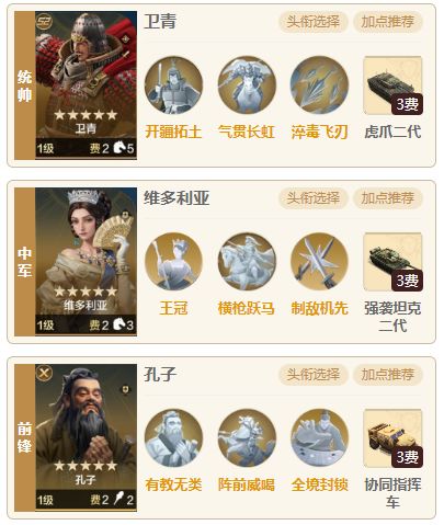 维多利亚的改版让追击队都获得了一部分的加强,也有一些新阵容出现,今天就为大家推荐一个搭配卫青孔子的控制追击队,这队在内战反面有着不少优势,打大秦控制阵容以及各种主动队也都是手到擒来,唯一就是就是卫青打不动肉队,即使是有新维多利亚的庇护还是会被芝诺比娅克制。 一.阵容搭配 1.组队思路 统帅卫青、中军维多利亚、前锋孔子,加点方面卫青维多利亚全攻、孔子全智即可。这队的核心思路就是孔子自带技能孔子以及制