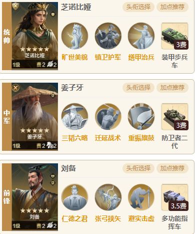 无敌铁王八打菜刀体系都是无脑低损强吃,内战无法打武则天的肉队体系,不过凑齐武则天恺撒芝诺高红且一堆璀璨技能打不过也正常,毕竟造价在那摆着,遇到姜子牙体系的芝诺队有一战之力只不过是无限平局 一.阵容介绍 1.组队思路 统帅芝诺比娅、中军姜子牙、前锋刘备,姜子牙可以联动芝诺比娅延长控制,放统帅防止爆头,且三人均有治疗能力加双减直接变成乌龟疯狂抗伤,不过打不了主动队毕竟是被克制武则天的肉队来了照样也打不