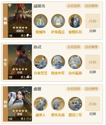 《世界启元》新赛季剧本陨火燃天已经开启,各首批区服也进入战斗阶段,最近用戚继光队科研了几种阵容,都能稳定针对当前版本强势追击郑成功队,通过治兵振旅+护身真言两个技能即可使用平民阵容克制顶配满红郑成功队。 阵容介绍 组队思路:由戚继光孙武虞姬组成的肉队阵容,虞姬孙武都是平民神卡能为队伍提供足够的防御和奶量,搭配戚继光组成勇冠三军的技能条件,使得队伍核心英雄的输出也得到提升。 技能搭配:戚继光这边【护