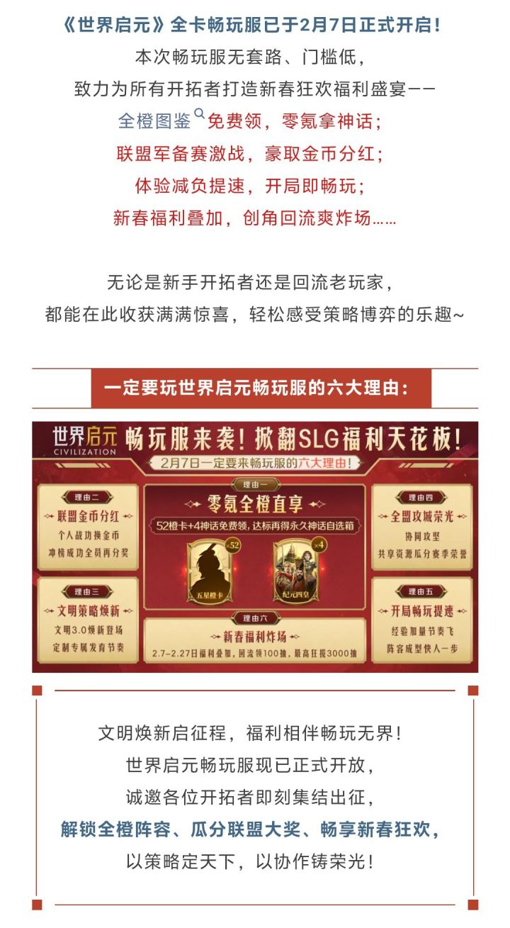 全图鉴!真免费!无套路!来就送!《世界启元》全卡畅玩服将于2月7日正式上线!50+全橙英雄及四皇直送,零氪轻松拿满全图鉴。军衔直升,战机助力,福利拉满。策略围城,文明智斗!拉上好友,新春爽玩~#世界启元 #世界启元civilization #畅玩服 #福利 #新春 #春节