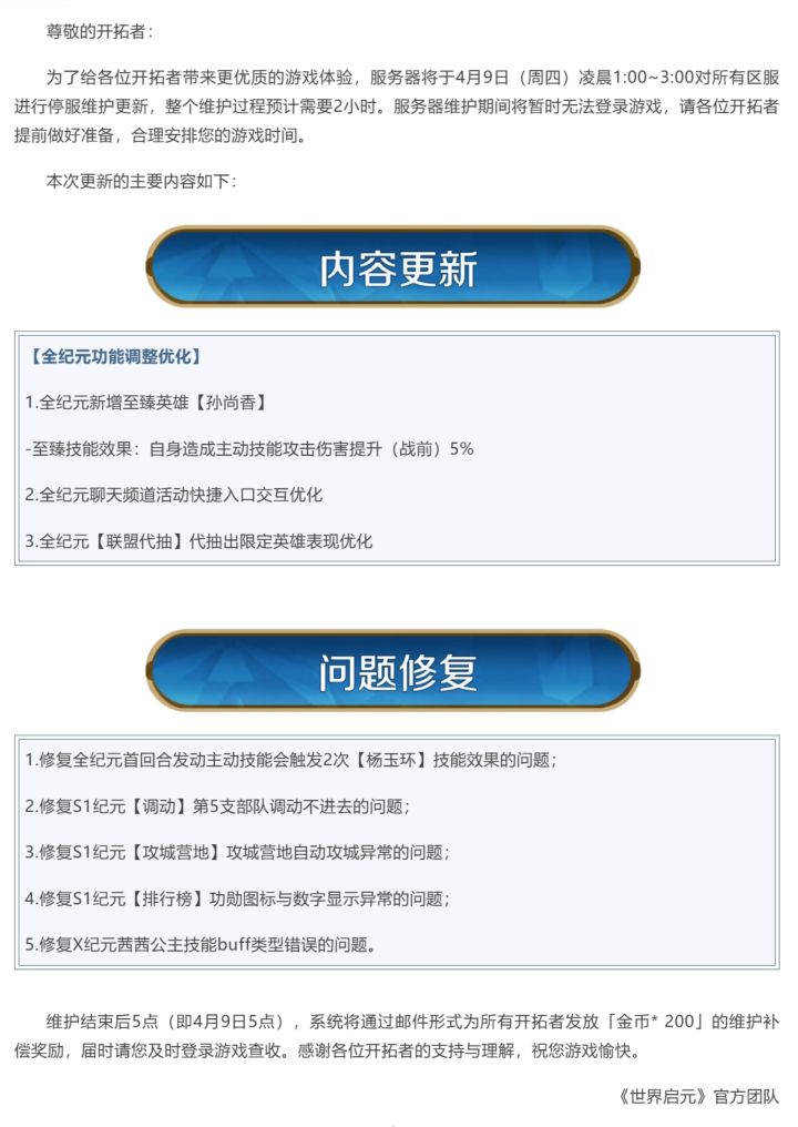 《世界启元》4月9日更新公告