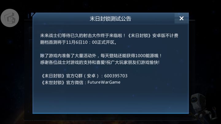公元2072年3月5日,人类文明遭受到外来种族残酷的侵略。人们将这一天,定为“星空劫难日”。为了生存和自由,人类开始反击…各位长官,世界已陷入危机,您,将拯救世界!本次不收费删档封测时间:7月18日-7月28日为了能让各位长官拥有更好的体验,每日均有大量能源送出,提前祝各位长官游戏愉快!唯一官方QQ群: 611637220除了游戏内准备了大量活动外,还有额外惊喜等着大家哦。一、能源狂