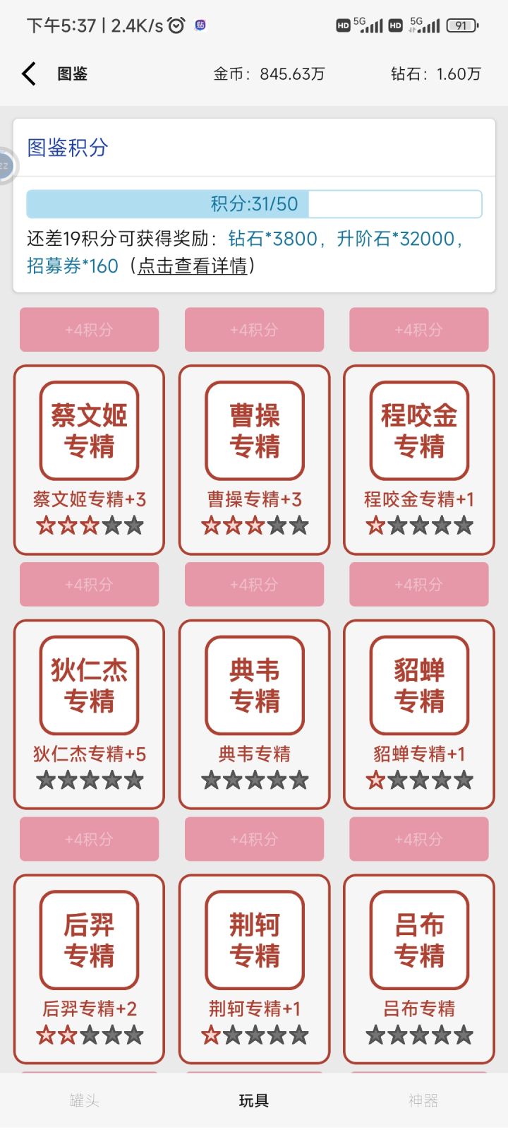 如下图,在图鉴里,红5的专精装会没有星。