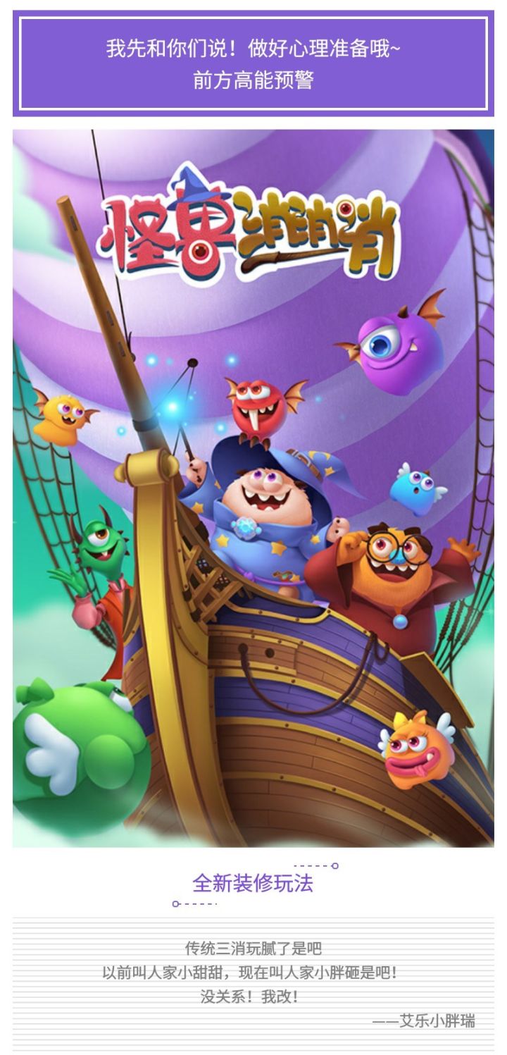 怪兽消消消更换了全新的图标,艾乐瑞抱着一锭金元宝给您来拜年啦!祝您财源滚滚,新年暴富!游戏开屏动画也更替为新春版本,整个怪兽家族身着节日盛装,个个喜气洋洋!共同祝您新春大吉、梦想成真。【活动形式】在本帖内回复“怪兽消消消,诸事大吉消烦恼”,并附上自己的怪兽游戏ID即可参与签到【活动时间】2019年02月01日—2019年02月13日【回帖示范】我的游戏ID:17583460怪兽消消