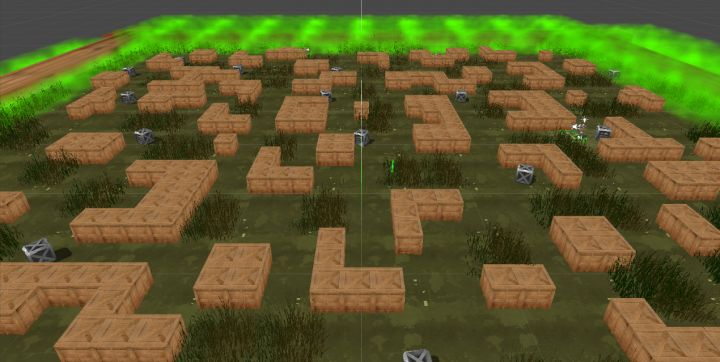 这期和大家聊聊PVP玩法的开发进度!话不多说,先上几张全景图!没错,就是大逃杀玩法,10人大乱斗!幸存者们被围困在一片荒地之中,绿色的毒雾从四周向中心蔓延,地图不断缩小,为了寻求一线生机,他们之间必须“互相伤害”,最终只有一位能逃出这里!目前场景中有毒雾、草丛、大木箱、补给铁箱、能量瓶等元素。- 毒雾:绿色气体,从四周向中心蔓延,一旦吸入毒雾便会受到伤害,必须马上逃离,否则会有生命危险