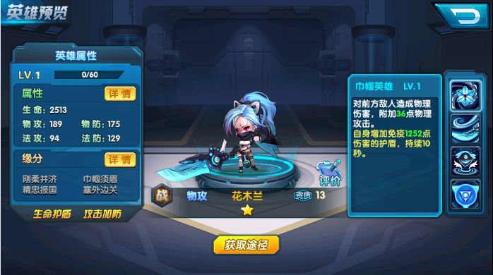 花木兰的事迹流传至今,中国古代巾帼英雄,忠孝节义,代父从军击败入侵民族而流传千古,唐代皇帝追封为“孝烈将军”。英雄类别:物理攻击技能说明:巾帼英雄:对前方敌人造成物理伤害,附加36点物理攻击。旋风斩:攻击单体敌人造成物理伤害,附加108点物理攻击。神盾守护:攻击单体敌人造成物理伤害,附加145点物理攻击。高级生命:自身生命永久增加5834点。缘分说明:大乔:刚柔并济--------