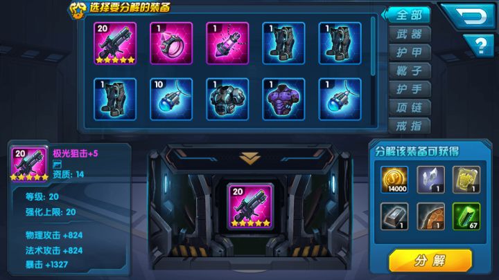 玩家在挑战各种副本的过程中,会获得很多不同品质的装备,随着游戏时间的增长,慢慢很多装备会被更高品质的装备替换下来,此时通过装备分解,将装备分解掉可以回收升级强化时,所花费的金币、锻造材料及精炼材料等装备分解:装备分解后,会保留一个初始状态的装备,不会分解为碎片形态,另外穿戴在身上的装备,无法进行分解
