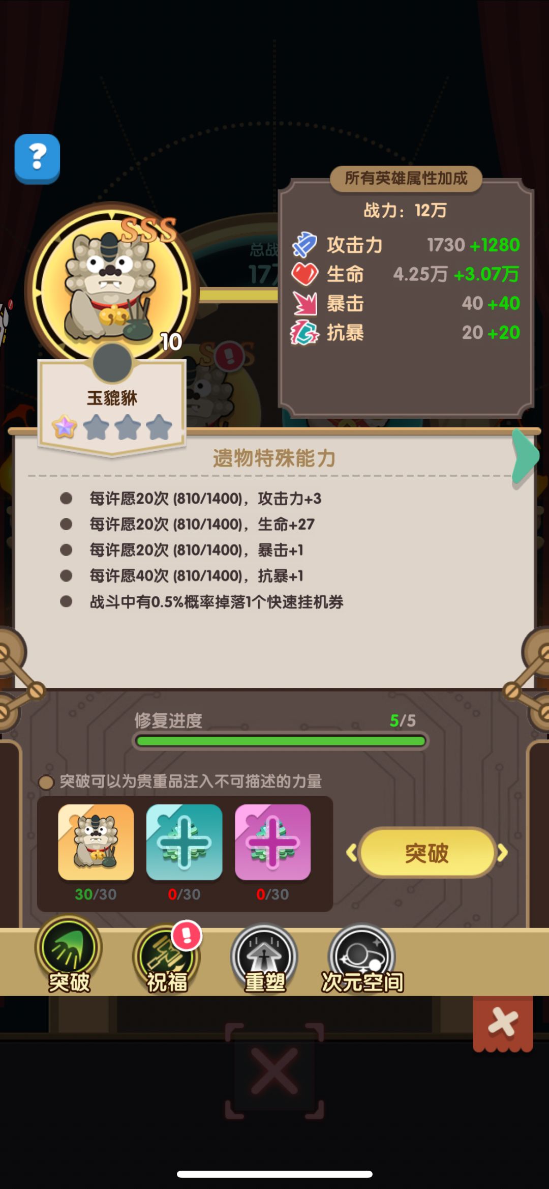 可以在熔炉里合成贡品,加速贡品的粉尘需要在破碎之地获得,祭坛升级可以获得图腾点数来升级属性和武器星级上限#浅评一下