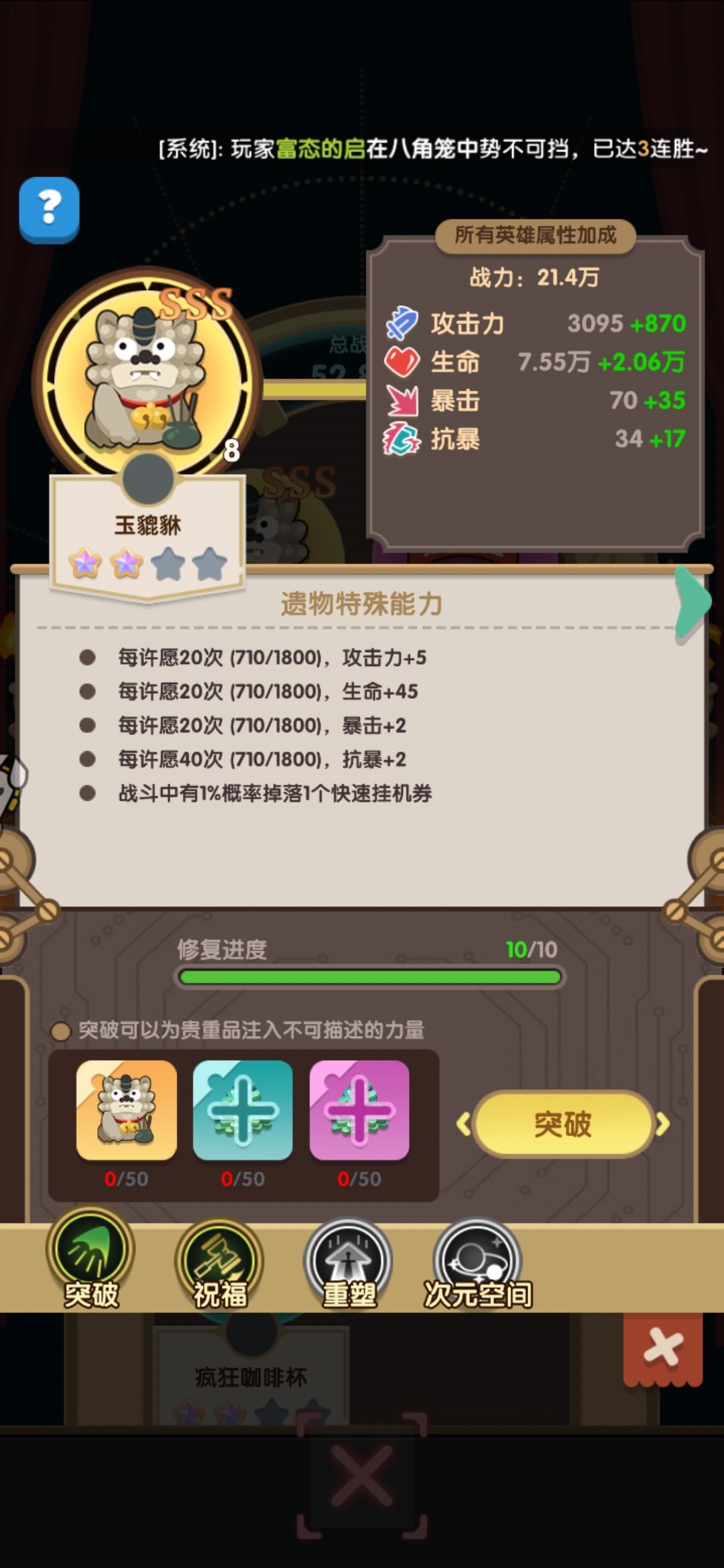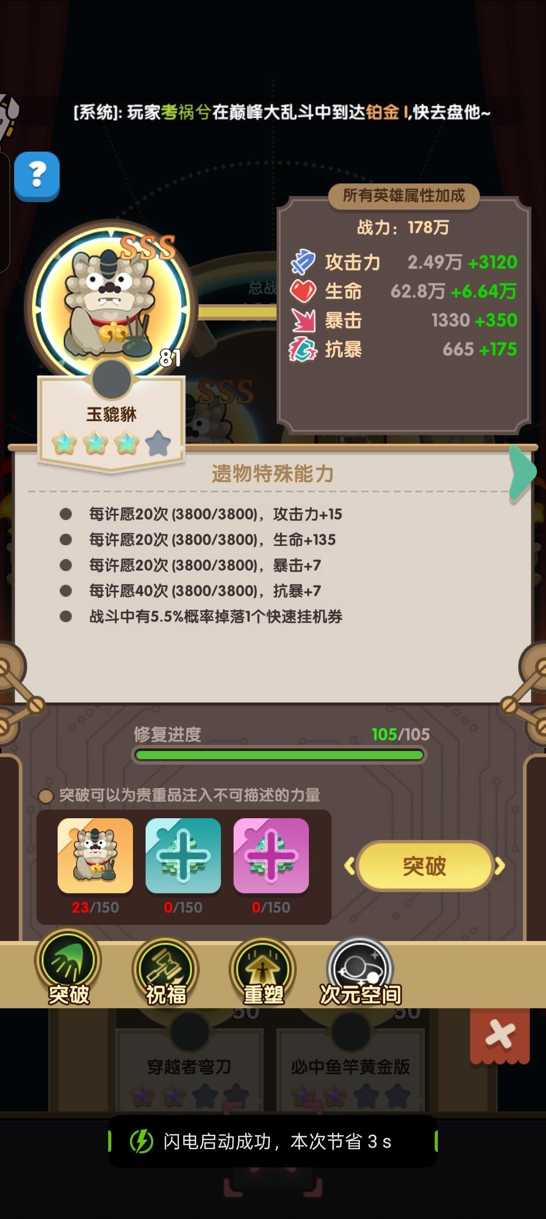 破碎之地保持连胜。可以获得大量加速粉尘。 熔炉尽量提升到可以制作永恒星核。 用刮刮周多出来的橙色武器碎片做材料, 升级图腾提高等级上限。战力嘎嘎加。 #游戏种草计划 #浅评一下 #巨像文明攻略