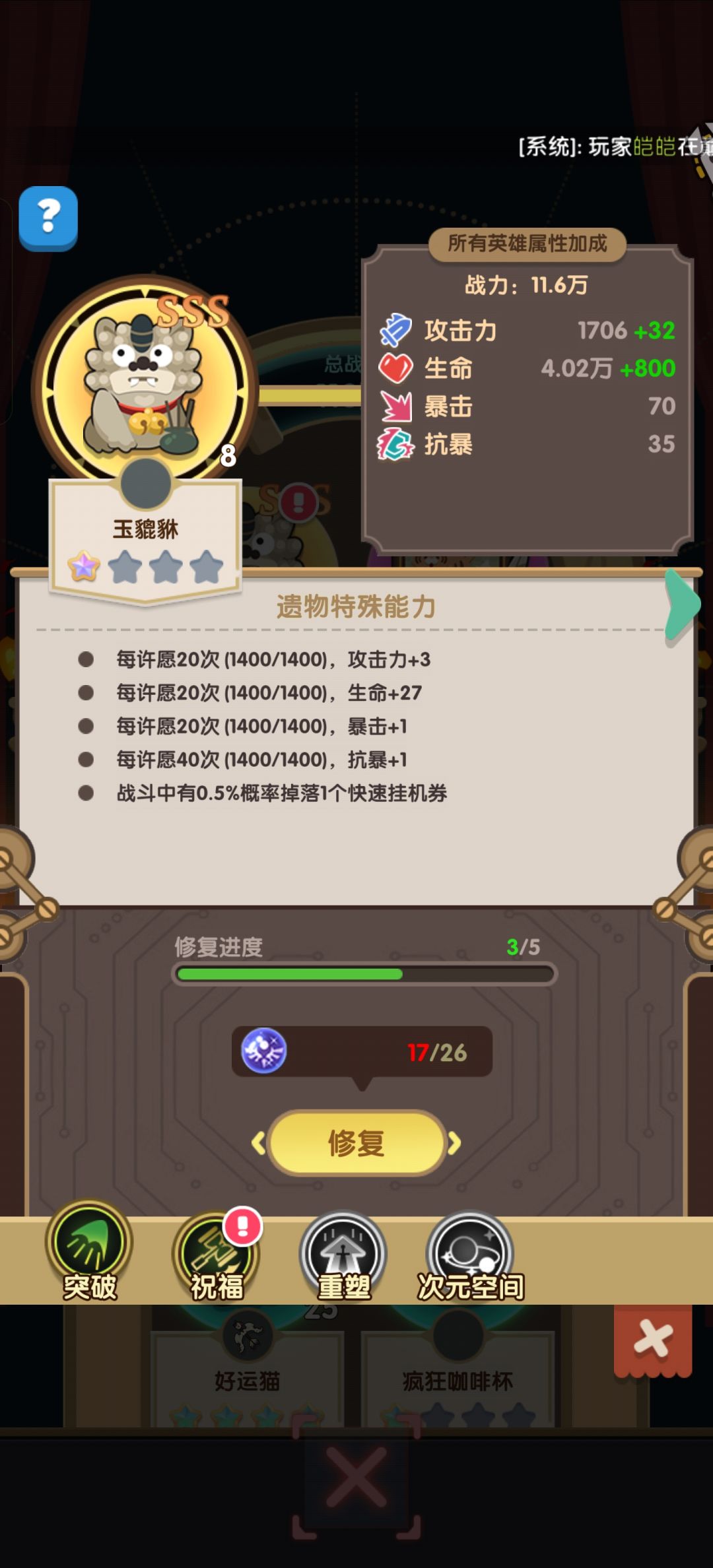 ID:u2-110-1056656,尽快升到满级,获得高阶的祭品,可以提升大战力