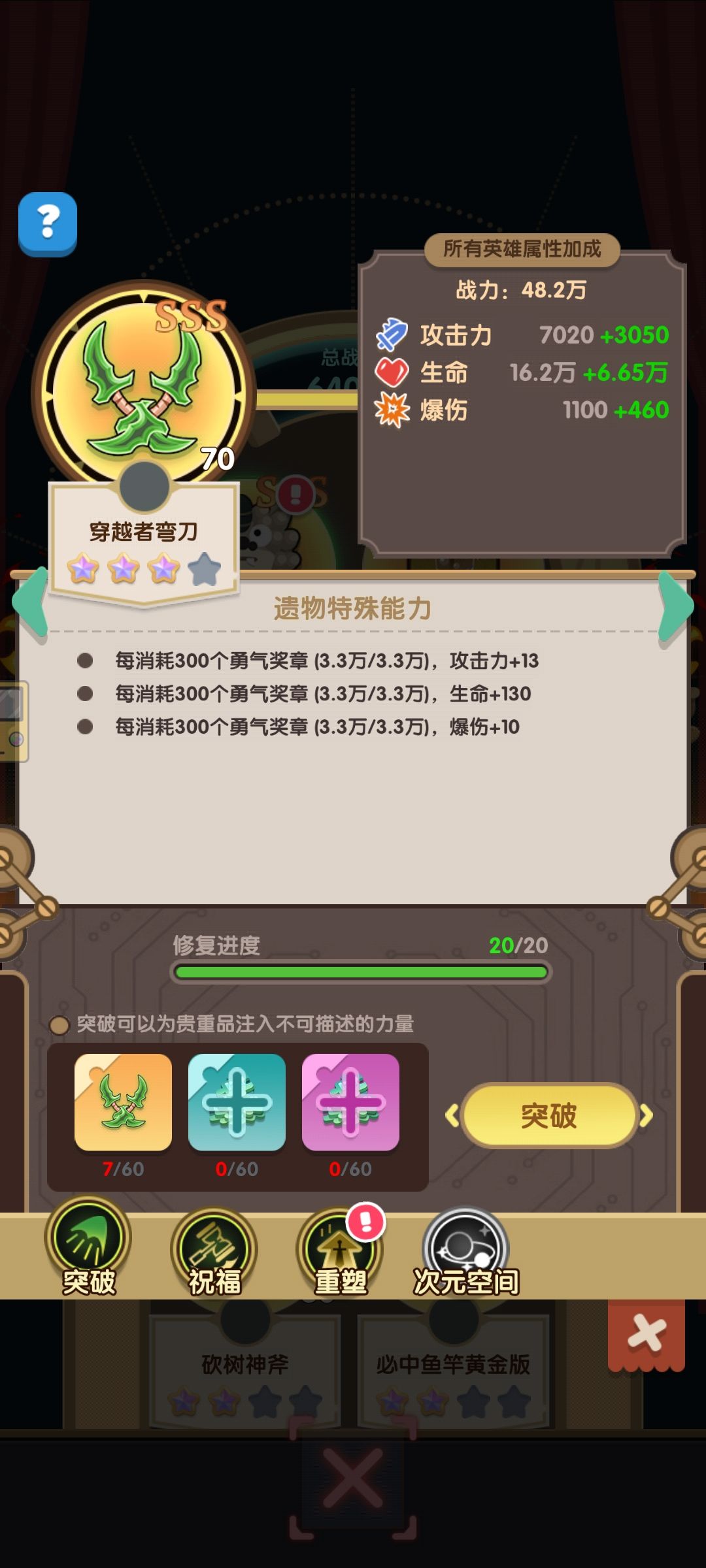 每许愿20次(498/1400),攻击力+3 每许愿20次(498/1400),生命+27 每许愿20次(498/1400),暴击+1 每许愿20次(498/1400),抗暴+1 战斗中有0.5%概率掉落第1个快速挂机券#浅评一下