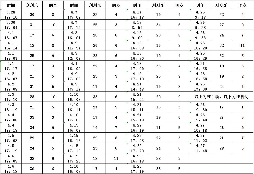 一、许愿池谣言 传言许愿池有各种谣言。 1、前几天更新许愿池爆率大跌,策划在暗改。 2、一天抽太多次奖励会被削。 3、手动爆率比自动爆率更高 其实我也有玄学,我觉得少人抽的时候爆率会更高,这个想法我上个月月底就有了,所以我开启了为期一个月测试。 本次测试,为每一轮500许愿币,只记录刮刮和图章的数量,由于我前面觉得每个十分钟的爆率不一样,所以我前期重点记录了,4.00-4.10,4.10-4.20