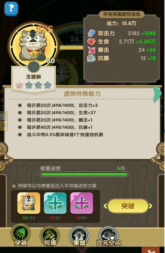 【玉貔貅贵重物品分享】 每许愿20次(498/1400),攻击力+3 每许愿20次(498/1400),生命+27 每许愿20次(498/1400),暴击+1 每许愿20次(498/1400),抗暴+1 战斗中有0.5%概率掉落第1个快速挂机券 #浅评一下