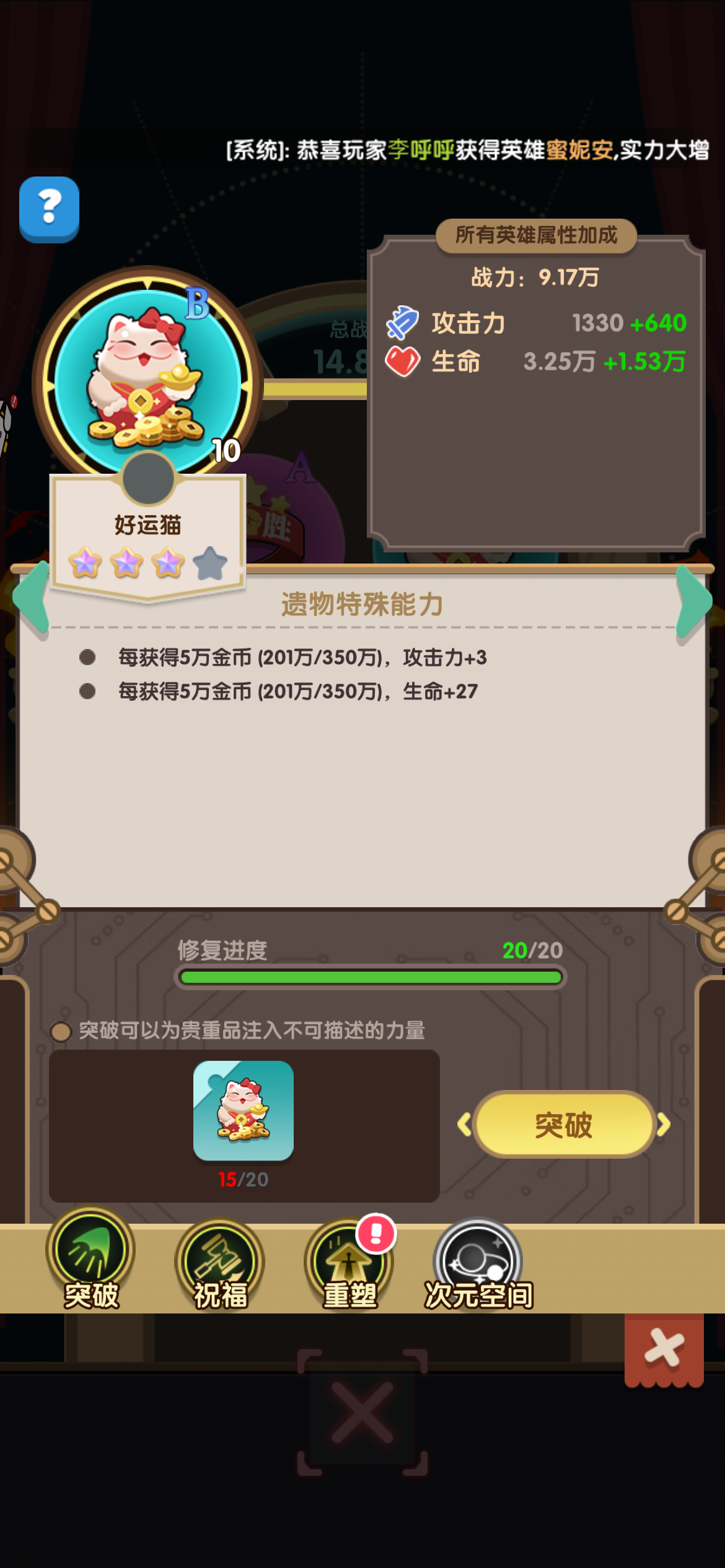 #浅评一下 这是必选的橙色贵重品,只要许愿币够多就能一直加强英雄属性,而且战斗有几率掉落加速券(竞技场也算),对于平民玩家来说是最大的福音,有机会一定要优先拿到