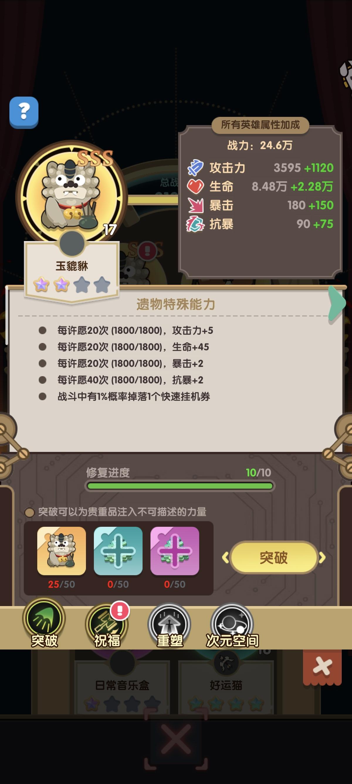 #浅评一下 这是必选的橙色贵重品,只要许愿币够多就能一直加强英雄属性,而且战斗有几率掉落加速券(竞技场也算),对于平民玩家来说是最大的福音,有机会一定要优先拿到